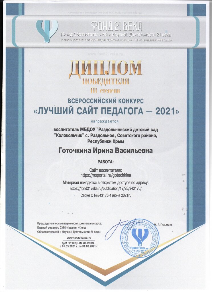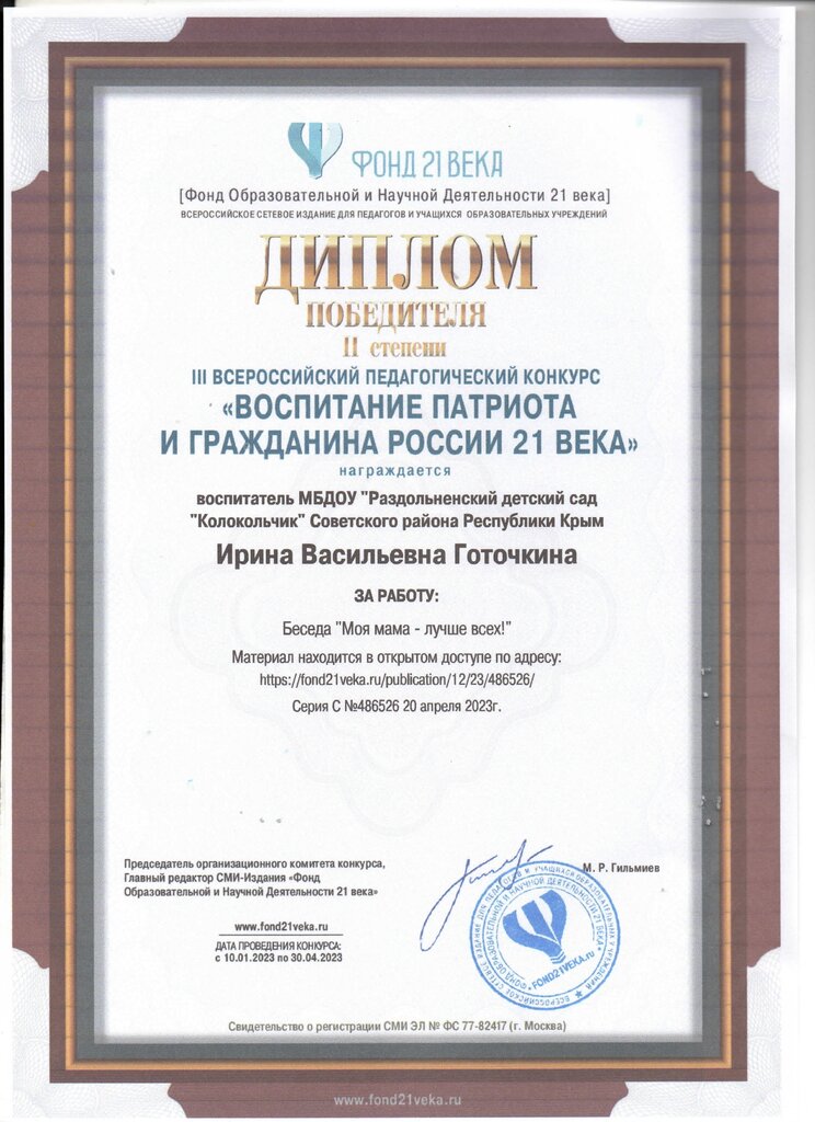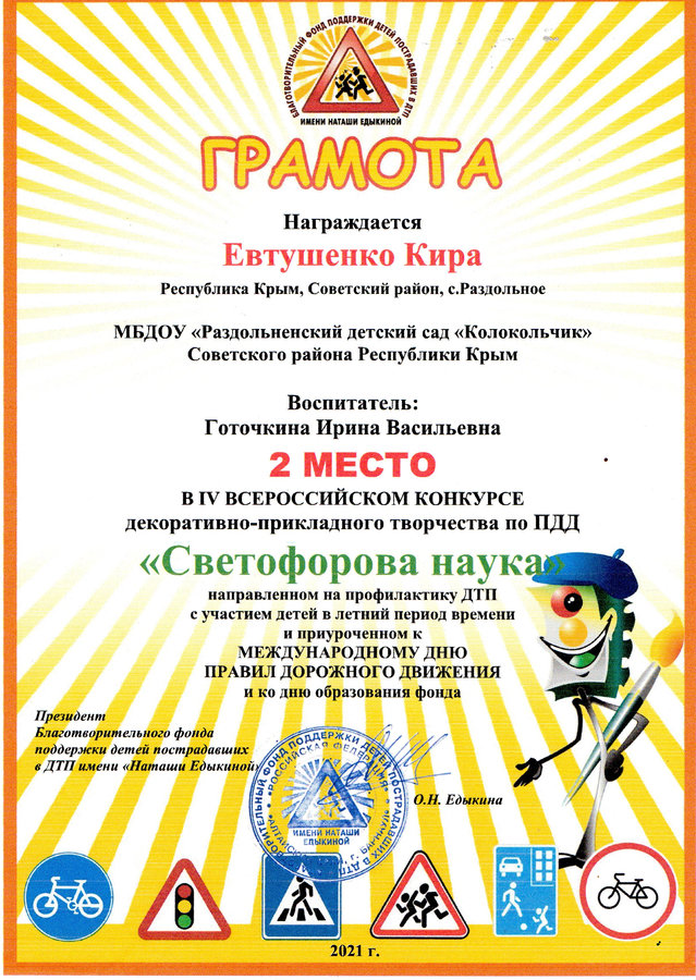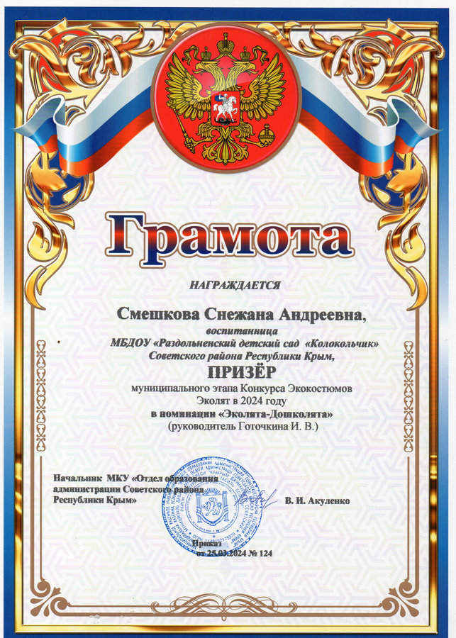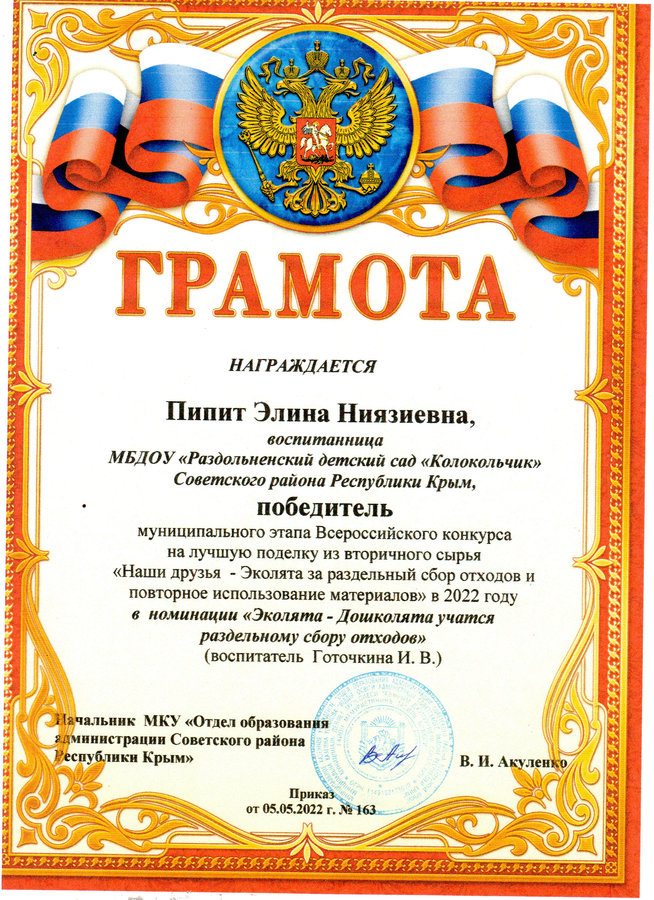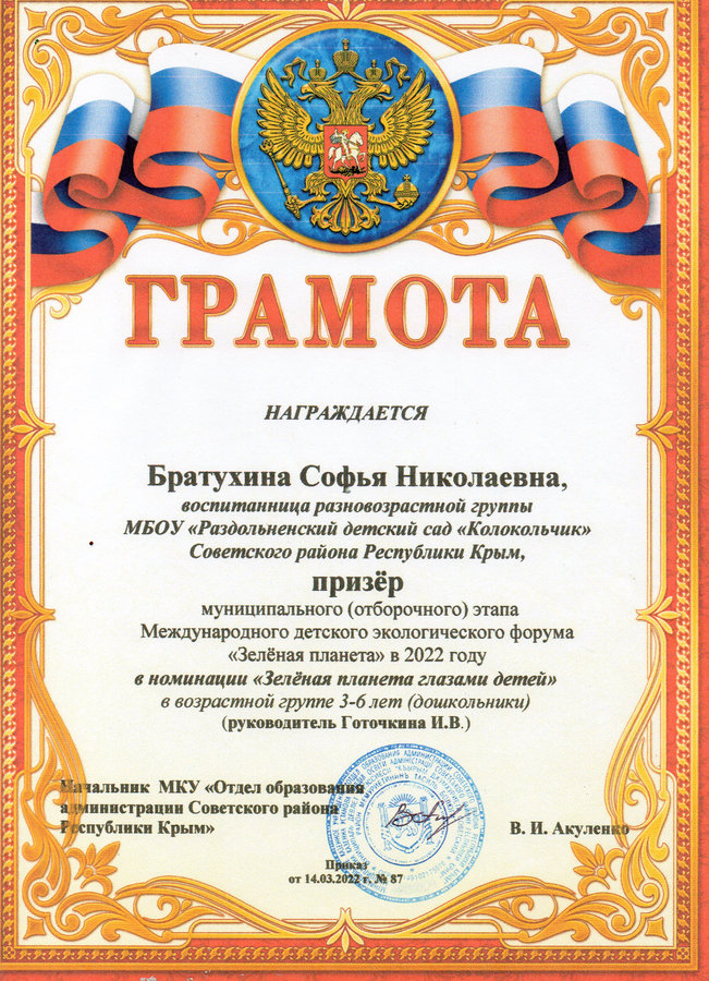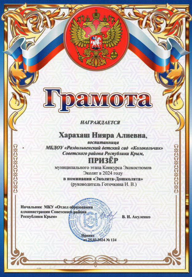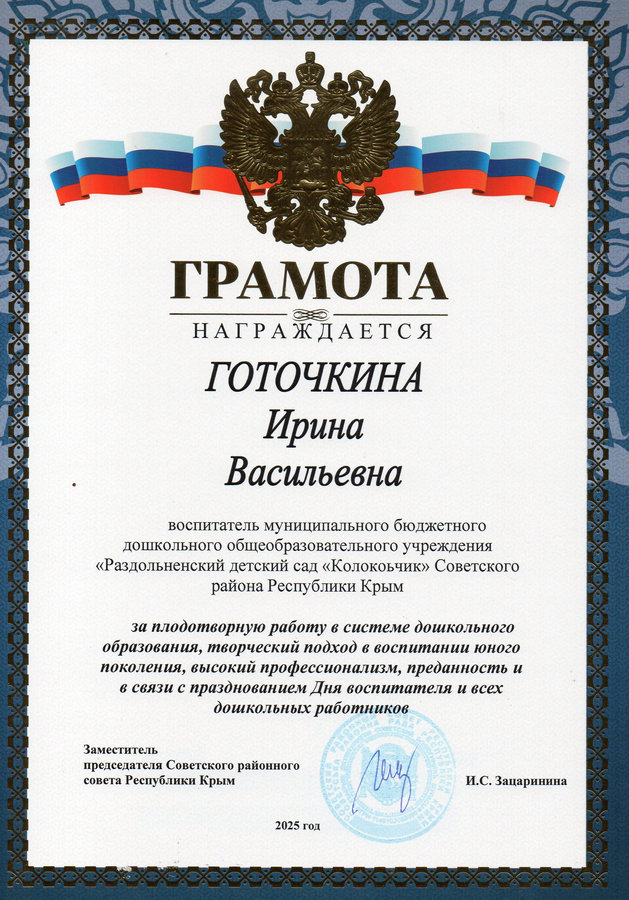 Награждения: Грамота МБДОУ "Раздольненский детский сад "Колокольчик" (2016г.)